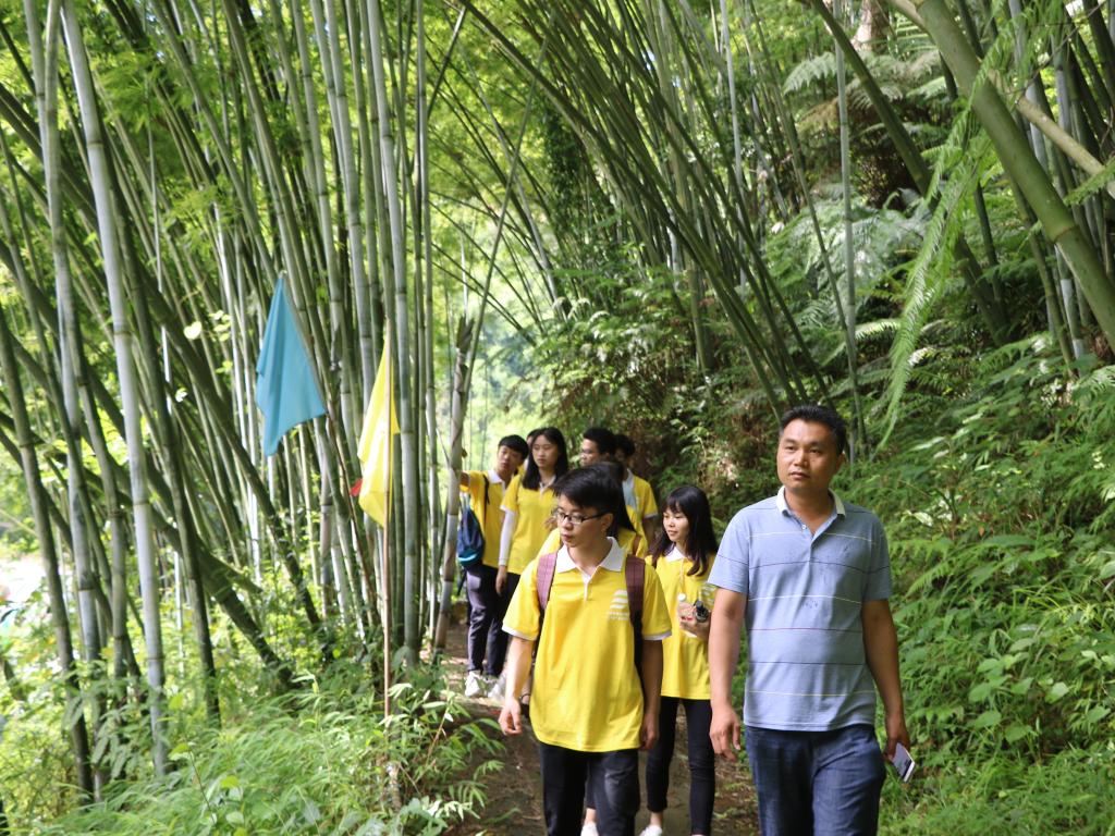 当地负责人官昌富对团队成员的到来表示热烈欢迎并介绍了竹子麓概况,随后带领大家走近竹子麓屯的生态基地,生态基地种植有麻竹800多亩,利用当地高山清泉养鱼50亩,培育竹林鸡,利用原生态森林发展红菌种植和野生果采摘,生态种植与生态旅游相互促进,共同发展,推动乡村经济发展,带领当地人民逐步脱贫。