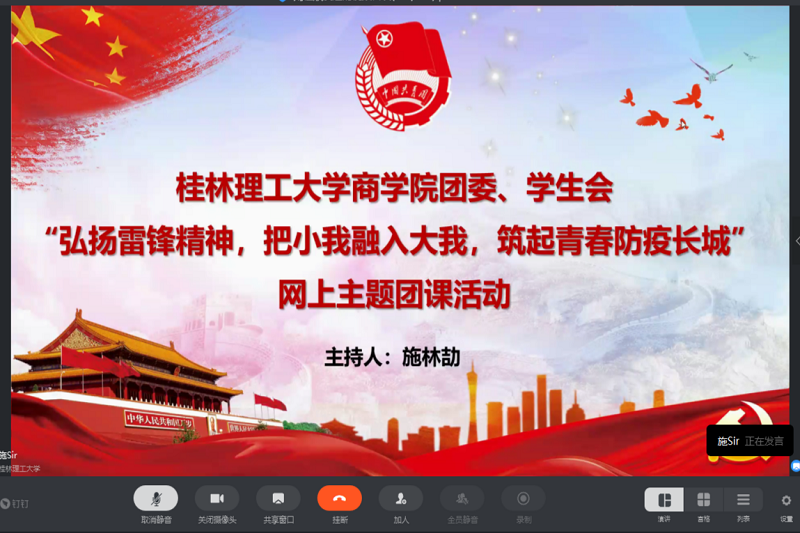 为大力弘扬雷锋精神,引导广大团员同心协力,共克抗疫时艰,3月24日下午,我院举办了“弘扬雷锋精神,把小我融入大我,筑起青春防疫长城”网上主题团课活动。我院团委、学生会指导老师覃泰树老师出席本次活动,伟德bv1946团委、学生会全体成员参加此次活动。本次团课通过钉钉网络会议平台举行,我院团委副书记施林劼老师主持本次团课。