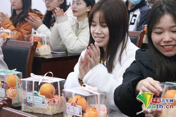 当考研学子看到每个橙子上都画有不同的表情时,他们都非常惊喜,收到礼物后,考研学子黄俏玲说:“收到礼物的第一感觉是包装很精美,每一个都画上了不同的表情,心情都变好了。特别是看到老师手写的寄语,觉得很温暖,很受鼓励。学校很关心在奋斗中的我们,非常开心!”考研学子刘佳欣表示:“虽然考研很难,但想到自己被关注和照顾着,就会觉得很温暖,希望我们都能上岸!”