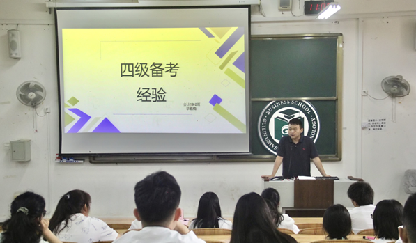 为提高同学们英语学习效率,扩大英语知识储备,助力广大学子通过四六级考试,我院于5月29日上午在雁山校区07120教室举办2021年春季学期英语四六级分享会。我院2020级辅导员敖明明出席本次活动,共由四位学生代表进行分享:会计2019-2班郑雅哲、会计2019-2班辛皓楠、工管2019-2班芮海南、会计2019-4班王鑫龙,我院120名学生参加本次活动。