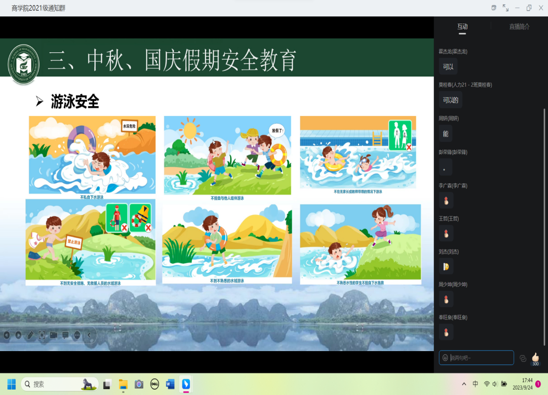 辅导员、班主任通过周末晚教育、主题班会、年级大会、下宿舍走访等多形式,围绕意识形态、舆情、电信诈骗、防溺水、防火灾、心理疾病与意外伤害、校内外交通安全、学生活动场所安全、学生宿舍管理等九个方面开展安全教育,尤其强调预防网络诈骗、禁止私自下水游泳等问题,要求学生严格遵守钉钉请销假制度、学校住宿管理规定,进一步增强了学生的安全防范意识,为切实维护好中秋国庆期间校园的安全稳定和谐打下坚实基础,筑牢校园安全防线。