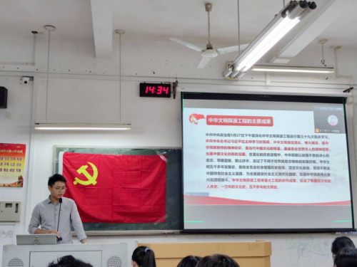 会议伊始,由王贤同志开展题为《从文明源头汲取复兴力量》的专题党课,重点从文明的相关概念、中华文明探源工程的主要成果和中华文明起源、形成、启示等进行了阐释和讲解。随后,支部成员一同观看《习近平主持十九届中共中央政治局第三十九次集体学习并发表重要讲话》的新闻报道视频。郭钰杰与梁莹同志分别从中华文明六大探源地和良渚遗址来讲述中华文明的深厚底蕴;张元针和杨怀鹏同志分享学习体会。接着,梁艳与程俊杰同志分享本民族的起源、风俗和传统节日等民族传统文化。随后,与会同志一同观看视频,覃露和李锦升两位同志分享个人学习心得。活动最后,支部书记王贤同志总结发言强调,文化兴国运兴,文化强民族强,作为青年党员要增强历史自觉,坚定文化自信,不断提高自身素养,主动扛起传承弘扬中华优秀传统文化的责任,为弘扬优秀传统文化、增强文化自信贡献青春力量。