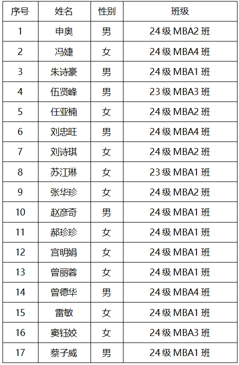 伟德国际victor1946第六届MBA联合会岗位竞聘将于2024年12月26日 (周四)晚上7点于伟德bv19467311教室举行。现将报名参加MBA联合会岗位竞聘的学生名单公布如下(以姓氏笔画排序):