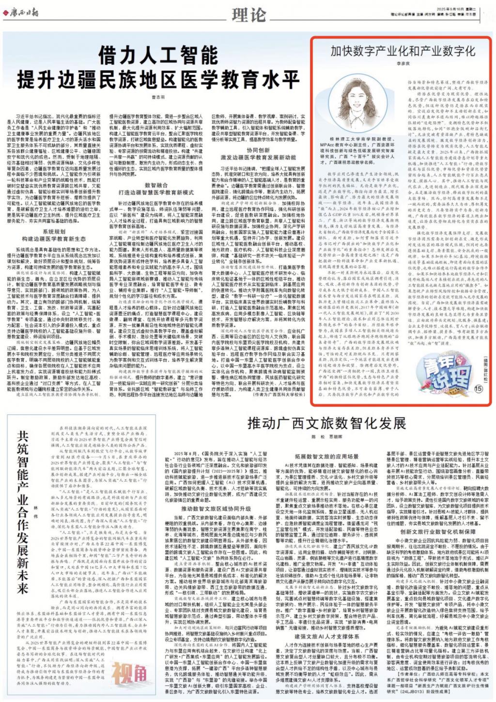 近日,《广西日报》“青年说理”栏目刊发我院李彦庆副教授理论文章《加快数字产业化和产业数字化》。文章从“不把一时差距视为永远落后”、“将潜在优势变为现实优势”、“强化数字经济发展保障支撑”等三个方面进行了介绍。现将全文转载如下。外宣稿链接:https://apph5.cloudgx.cn/article/sync1967727903722569728李彦庆:伟德bv1946副教授、MPAcc教育中心副主任,广西资源环境科技创新与绿色低碳发展研究智库研究员...