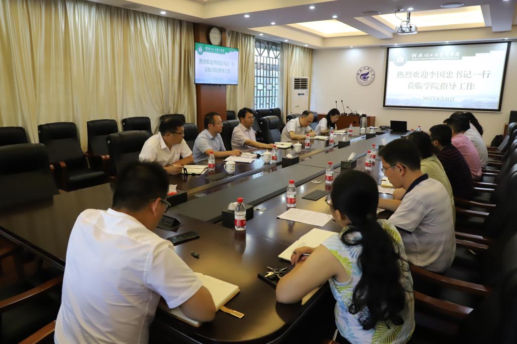 2021年8月31日下午,学校党委书记李国忠在组织部部长唐壮东,党办(校办)主任张成龙,教务处副处长唐国强,发展规划与教学质量监控中心李亚娟等人的陪同下莅临我院检查指导新学期工作,学院领导班子、院长助理参加了会议。
