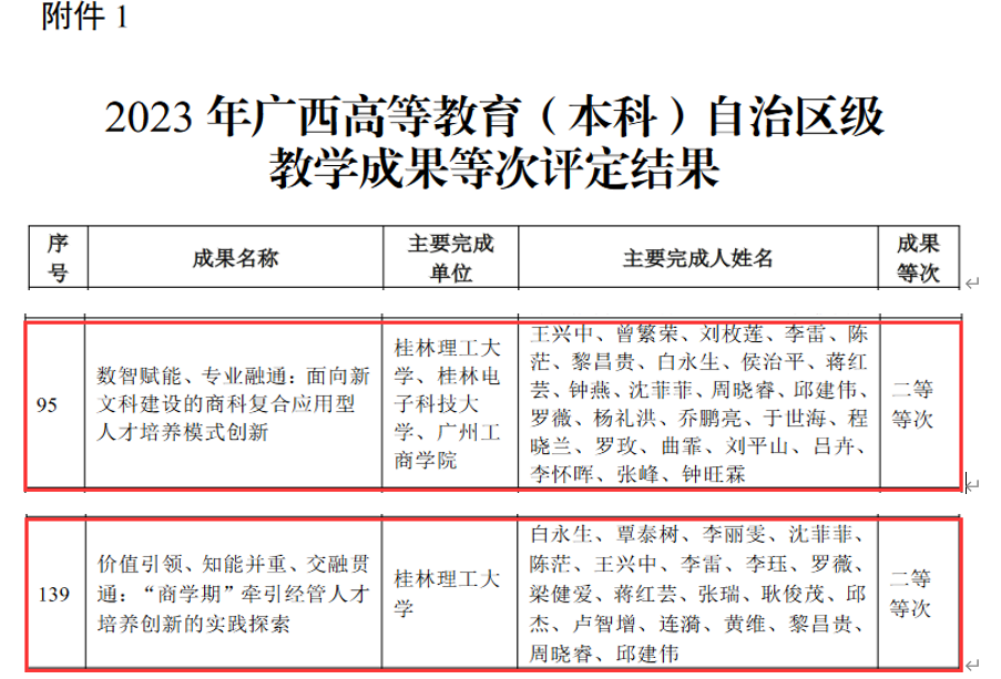 近日,自治区教育厅公布了《自治区教育厅关于公布 2023 年广西高等教育自治区级教学成果等次评定结果的通知》,我院白永生教授主持的《价值引领、知能并重、交融贯通:“商学期”牵引经管人才培养创新的实践探索》和王兴中正高级实验师主持的《数智赋能、专业融通:面向新文科建设的商科复合应用型人才培养模式创新》的2项成果均获自治区二等等次。