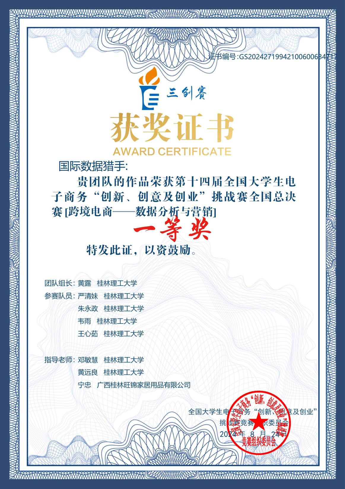 第十四届全国大学生电子商务“创新、创意及创业”挑战赛全国总决赛于2024年8月2日圆满落下帷幕。本届比赛全国报名参赛的队伍共有18万支,我校共选拔了6支队伍参赛。其中邓敏慧副教授、黄远良博士、宁忠总经理(企业导师)指导的作品“数智引领探索电商新蓝海——以跨境电商厨房家居产业为例”经过校赛、省赛选拔,以广西赛区跨境电商数据分析与营销赛道第一名的好成绩成功晋级全国总决赛。并最终获全国总决赛一等奖,三位指导老师同时获得该赛事全国总决赛优秀指导老师。