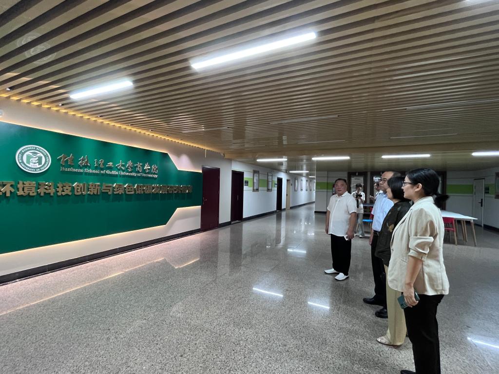 区捷一行首先参观了学院院史墙、文化墙、科技智库。白凌婷从学院历史沿革出发,对学院经过近40年的创新发展,所形成的以“培养行业英才,贡献商科智慧,服务重大战略,推动绿色发展”为使命,以“成为扎根八桂大地的卓越伟德bv1946”为愿景,以“志存高远,取精用弘”为价值观的文化进行了讲解。同时,对学院紧扣属地经济社会高质量发展需求,秉持“突出使命引领,突出区域属性,突出行业特色,突出学科交叉”的理念,围绕广西资源可持续利用与绿色创新、广西污染防治与生态环境科技创新、广西科技支撑碳达峰碳中和研究、桂林市国家可持续发展议程创新示范区建设研究等四个方向,有组织推进科技智库建设进行了详细汇报。