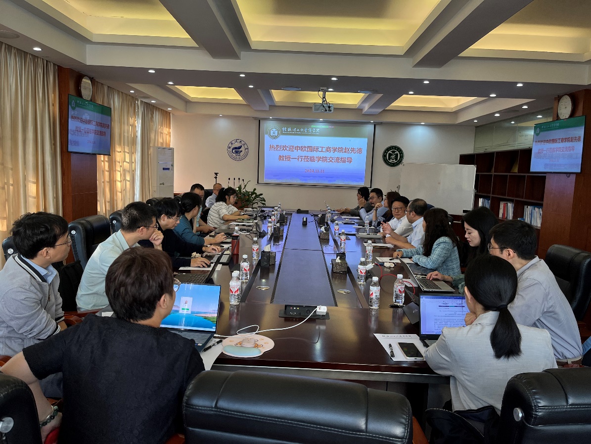 赵先德教授对我院近年来取得的发展成绩表示肯定,对我院通过政产学研合作模式,结合学校学科结构与区域发展特色办商科教育的做法表示赞赏。赵先德教授表示,中欧供应链创新研究院目前正在围绕供应链全球化、数字化、低碳化等主题,与行业头部企业、跨国公司同行,整合国内外优质资源,协同推动各类研究,一方面发表高质量文章,为理论创新做出贡献,另一方面开展企业咨询、推动全球高端智库建设,进而服务国家及区域重大战略实施落地。赵先德教授强调,广西作为我国沿海沿江沿边的少数民族自治区,具有独特的区位优势和丰富的实践素材,后续期望与我院围绕ESG、绿色低碳发展、制造业转型升级、农业供应链运营管理等主题,在科学研究、智库研究、案例开发、MBA项目、EDP项目、人才培养等方面开展实质性合作。