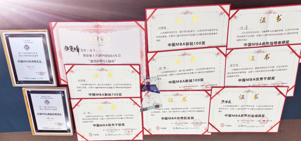 会上,学院师生以出色的表现荣获多个奖项。沈鸿教授荣获“中国MBA优秀指导老师奖”,MBA联合会荣获“中国MBA优秀联合会”,“迎五一· 寻找身边最美劳动者摄影大赛”活动荣获“中国MBA卓越品牌活动”,校友吴廷树荣获“中国MBA优秀校友奖”,陈家虎同学荣获“中国MBA优秀创业成就奖”,张万成和王挺同学荣获“中国MBA优秀干部奖”,伍贤峰、刘婧瑜和胡爽同学荣获“中国MBA新锐100奖”,伍贤峰同学荣获“最具影响力人脉奖”。