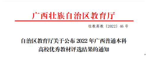 近日,自治区教育厅印发《自治区教育厅关于公布2022年广西普通本科高校优秀教材评选结果的通知》(桂教高教〔2022〕46号),我院连漪教授、蒋红芸副教授两位老师主编的教材分别获得广西普通本科高校优秀教材一等奖、二等奖,是我院首次获得自治区级优秀教材一等奖。