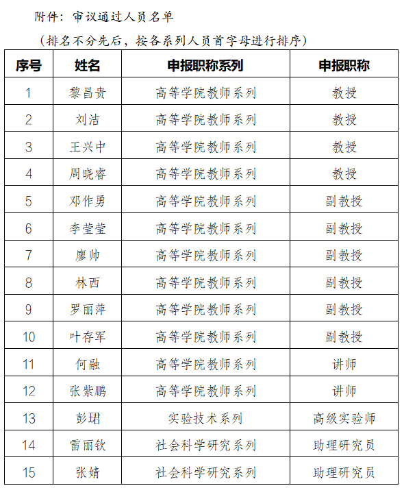 根据学校职称工作安排,学校职称审议推荐小组于2025年10月11日对申报职称人员的政治思想表现、职业道德、学历资历、专业工作经历(能力)、业绩成果等材料进行了审议。其中黎昌贵等15位同志满足本人所申报的职称评审条件,予以推荐。为充分体现“公开、公平、公正”的原则,现将审核推荐结果及个人申报材料予以公示,公示期从2025年10月14日至10月20日,材料公示地点为伟德bv19467210室。如对所公示的人员有异议,请于2025年10月20日17:00前以书面方式向学校职改办或学校纪委或伟德bv1946党政办公室反映,书面材料请签署本人真实姓名并附联系方式。真实反映意见者受国家法律保护(根据文件规定,匿名意见不予受理)。电话:0773-5892982。