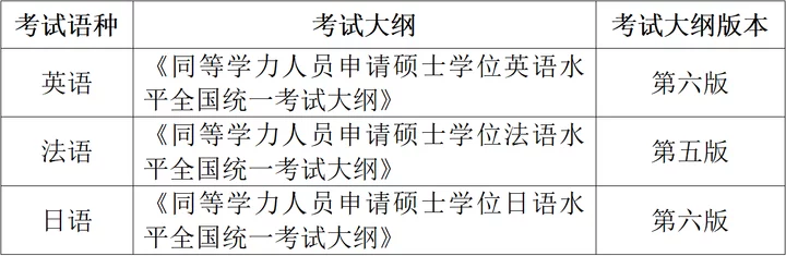在册人员在学习期间可报名参加同等学力人员申请硕士学位外国语水平全国统一考试,部分专业须参加学科综合水平全国统一考试。外国语水平考试语种、考试大纲使用对照表如下所示: