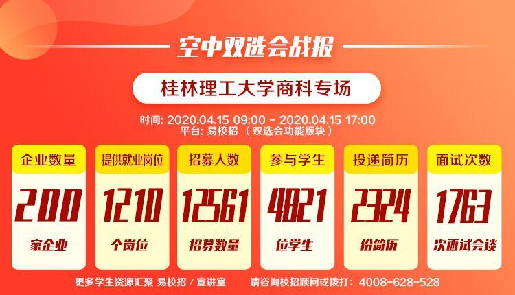 为组织好本次线上双选会,学校就业指导服务中心和我院积极筹备、精心组织,通过易校招、毕业学生联络群等平台发布双选会信息。经用人单位积极报名、学校认真审核,共确定了200家用人单位参会,提供就业岗位1210个,招聘需求12561人,提供了与电商营销、财务管理、人力资源等专业匹配度较高的工作岗位,也有部分工科岗位。截止到4月15日下午17:00,本次线上双选会圆满结束,共吸引了我校4821名毕业生线上光顾双选会,投出2324份简历,线上面试次数1763次,部分毕业生已和用人单位达成初步就业意向。