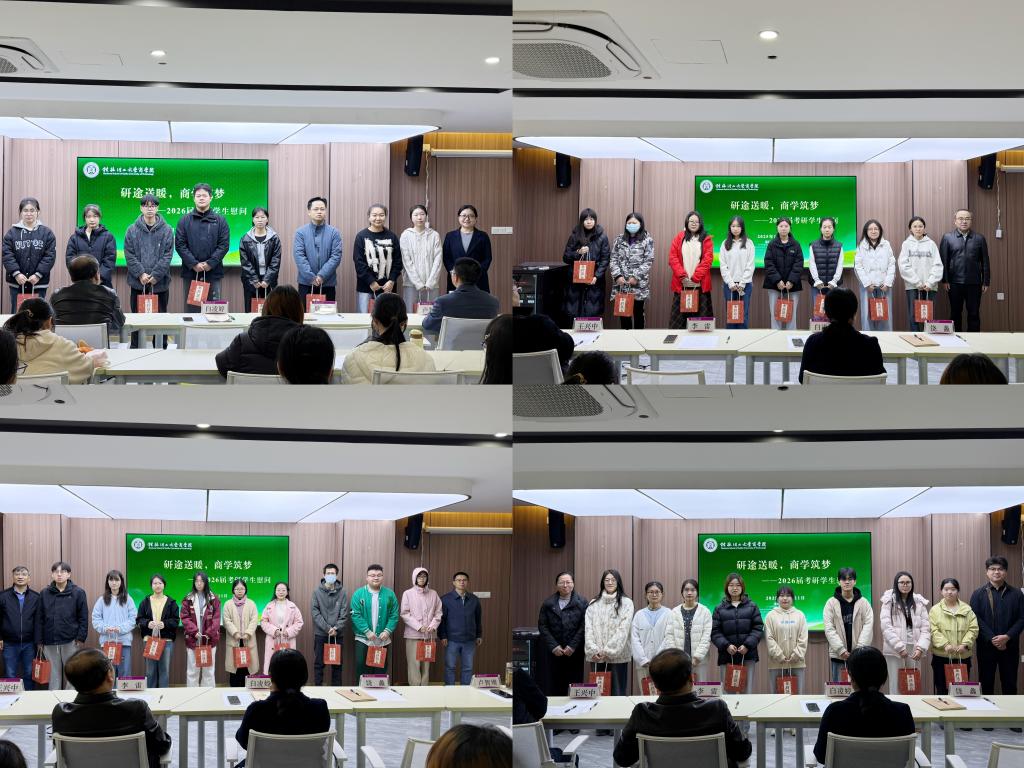 为加强对考研学生的关怀与支持,缓解冲刺阶段心理压力,12月11日上午,学院在屏风校区7213党员之家举办“研途送暖,商学筑梦”2026届考研学生慰问活动。学院党委书记白凌婷,党委副书记、院长李雷,副院长王兴中、卢智增出席活动,班主任和辅导员代表以及考研学生代表共同参加了本次活动。本次活动由学院党委副书记、纪委书记饶蠡主持。