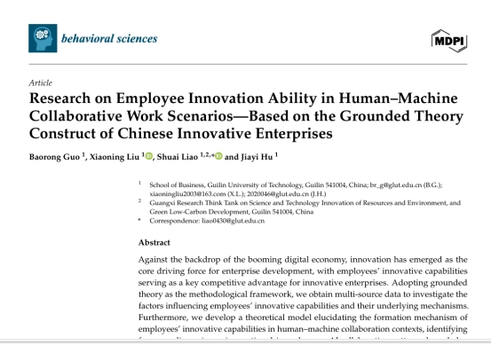 伟德bv1946郭宝荣正高级工程师和伟德bv1946副研究员廖帅、伟德bv1946教师胡嘉议、伟德bv1946研究生刘小宁合作完成的论文《Research on Employee Innovation Ability in Human–Machine Collaborative Work Scenarios—Based on the Grounded Theory Construct of Chinese Innovative Enterprises》于2025年6月发表在《Behavioral Sciences》。