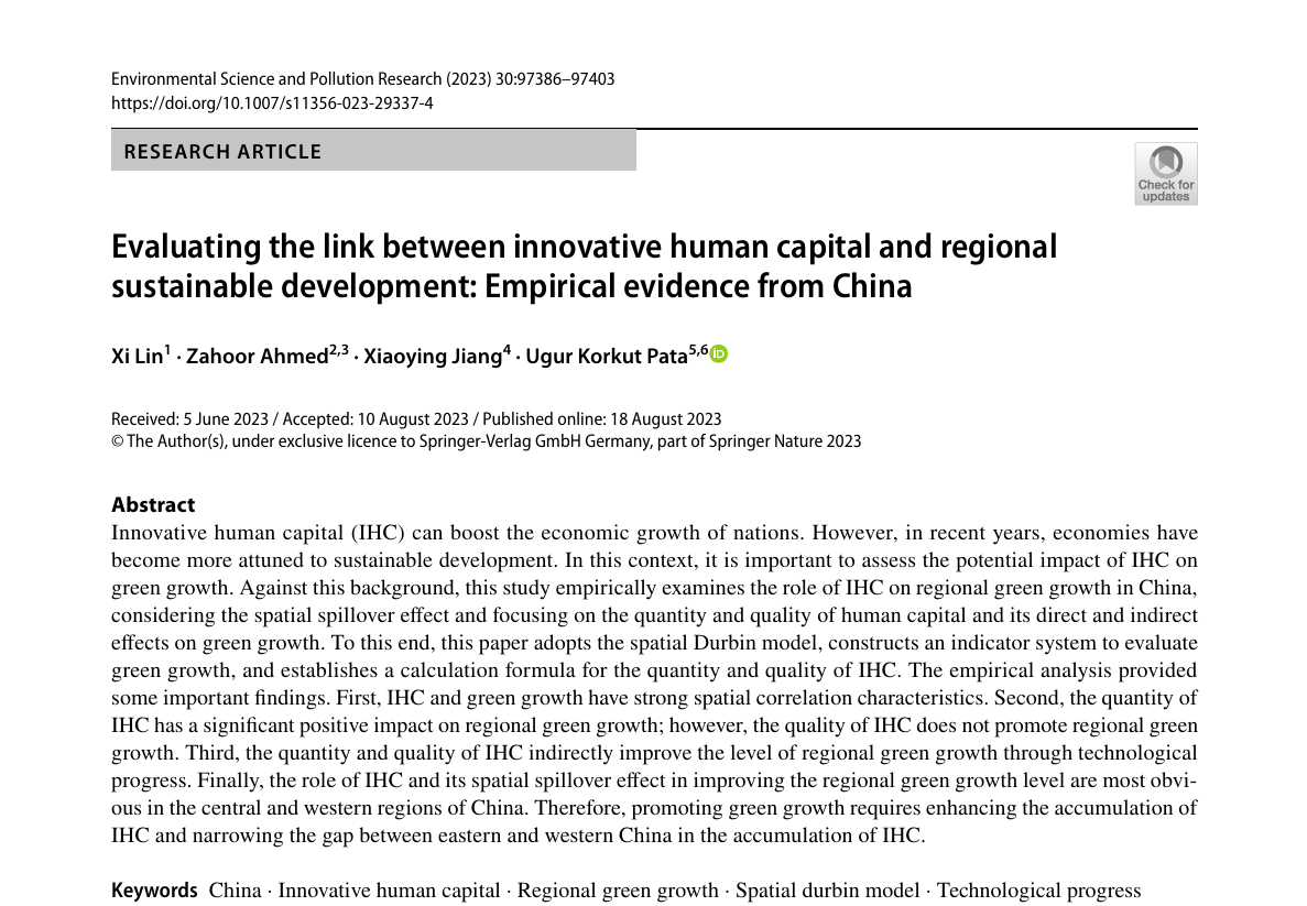 伟德bv1946教师林西和蒋小瑛教师与Ahmed, Zahoor、Ugur Korkut Pata合作完成的论文《Evaluating the link between innovative human capital and regional sustainable development: empirical evidence from China》于2023年8月18日发表在《Environmental Science and Pollution Research》第30卷第43期。