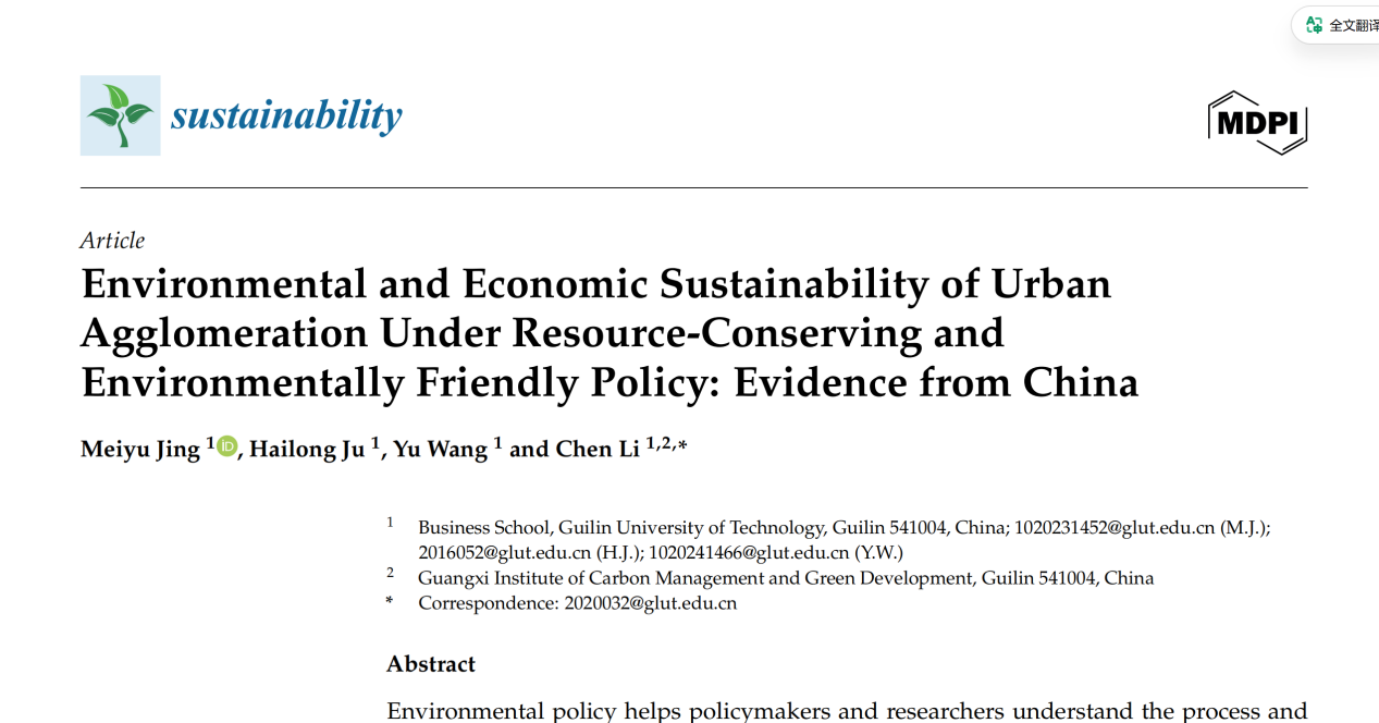 伟德bv1946教授鞠海龙与伟德bv1946副教授李琛、伟德bv1946硕士研究生荆美谕、王宇合作完成的论文《Environmental and Economic Sustainability of Urban Agglomeration Under Resource-Conserving and Environmentally Friendly Policy: Evidence from China》于2025年8月发表在《Sustainability》。
