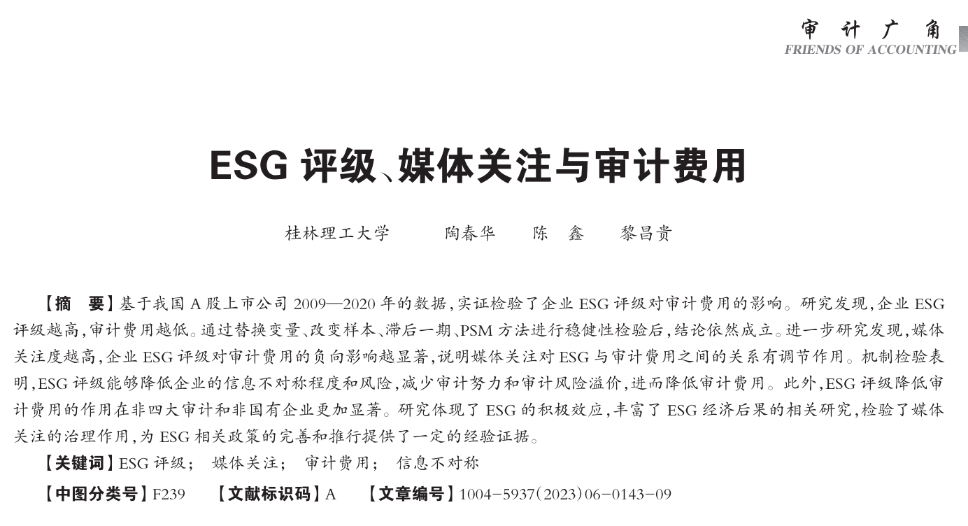 原文出处:陶春华,陈鑫,黎昌贵.ESG评级、媒体关注与审计费用[J].会计之友,2023,(06):143-151.