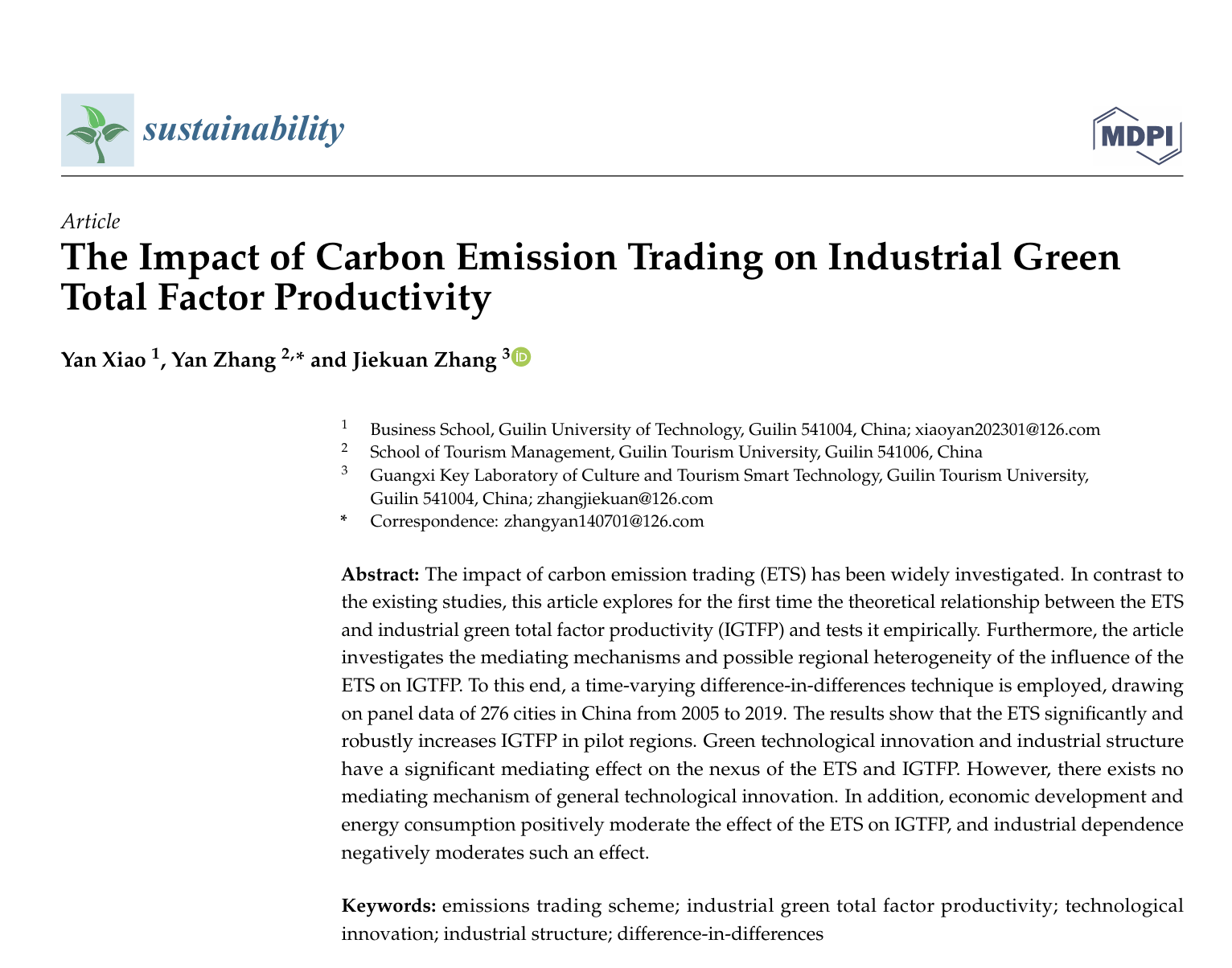 原文出处:Xiao, Y.; Zhang, Y.; Zhang, J. The Impact of Carbon Emission Trading on Industrial Green Total Factor Productivity. Sustainability 2023, 15, 6167. https://doi.org/10.3390/su15076167.