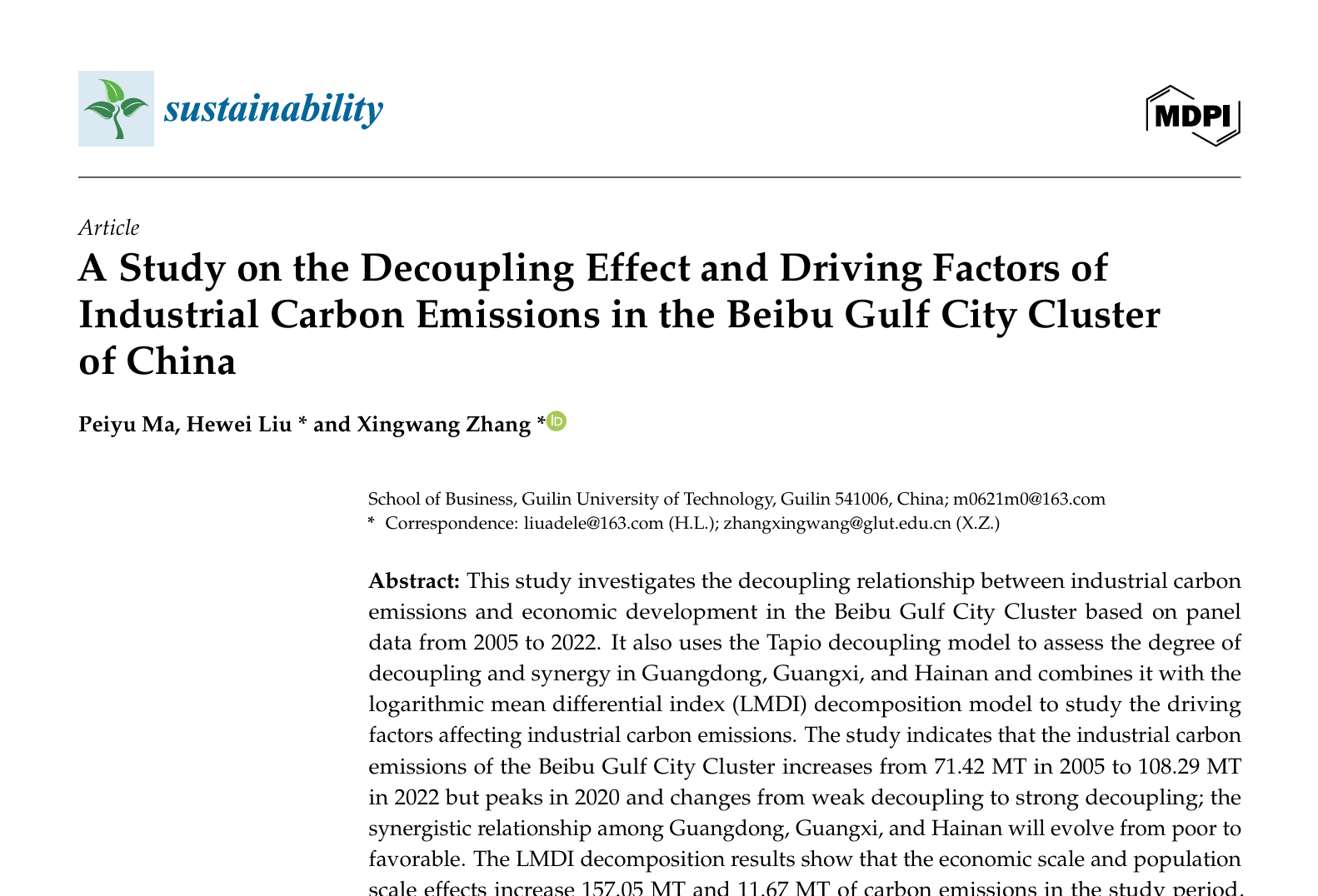 伟德bv1946副教授刘河伟与伟德bv1946教授张兴旺、伟德bv1946硕士研究生马培育合作完成的论文《A Study on the Decoupling Effect and Driving Factors of Industrial Carbon Emissions in the Beibu Gulf City Cluster of China》于2025年4月发表在《Sustainability》。