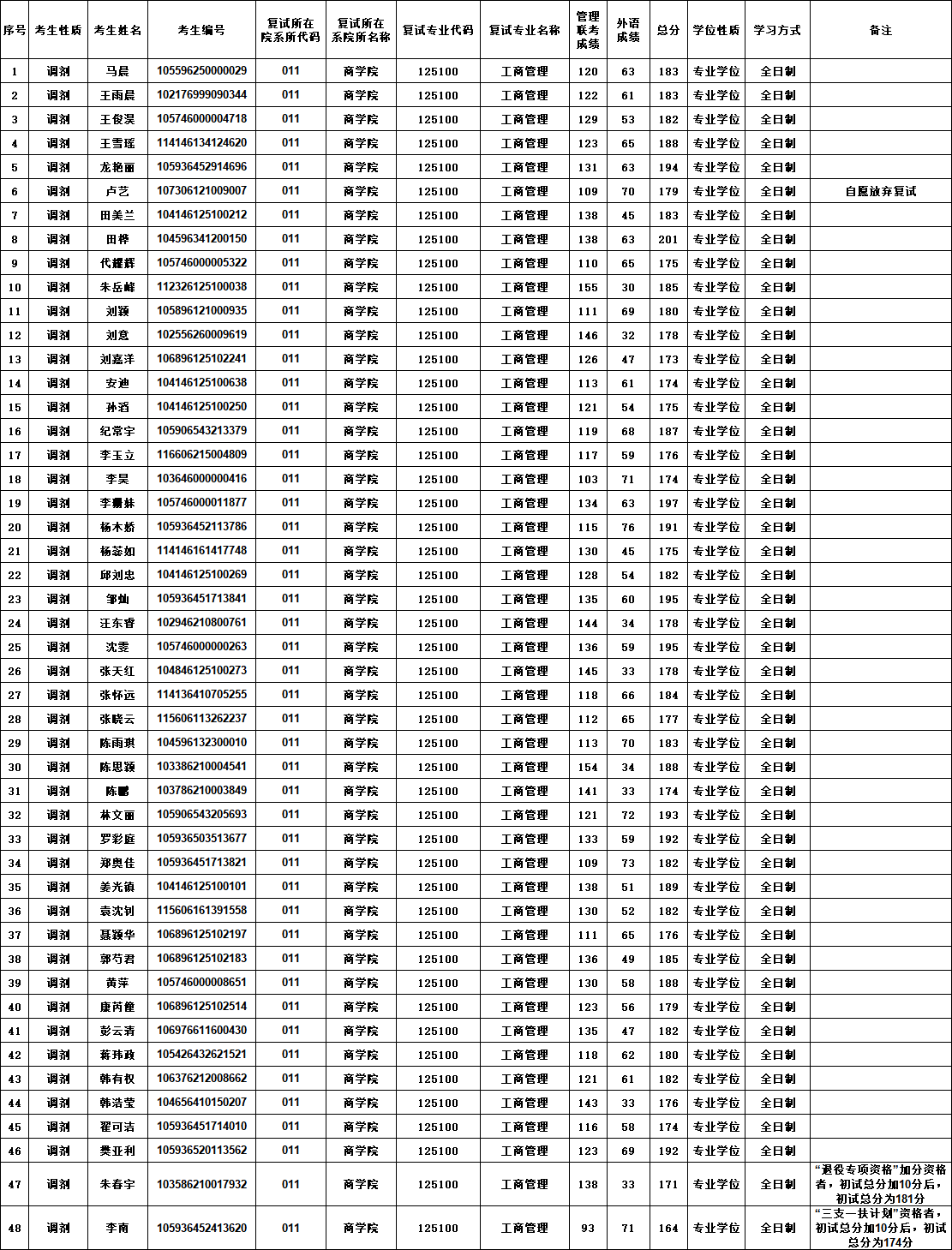 工商管理专业2026年调剂考生复试名单(全日制)(按考生姓氏笔画顺序)