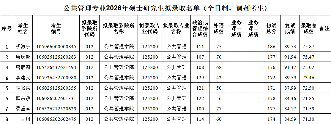 根据《2026年全国硕士研究生招生工作管理规定》及教育部相关文件规定,现对我院公共管理专业2026年硕士研究生拟录取名单进行公示,公示期:2026年4月12日至4月18日。有异议者,请在公示期内以书面形式,并署真实姓名和联系电话,向我院纪委或我院办公室反映,不署真实姓名的,不予受理。联系电话:0773-5892136(纪委),0773-5893657(办公室),电子邮箱:duxingfa2015@163.com。公示名单如下: