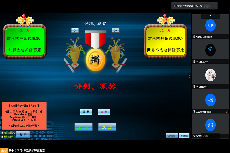 为了丰富同学们单一的宅家生活,展现出疫情期间当代大学生朝气与活力,我院于4月14日下午举办了2020年伟德bv1946春季学期线上辩论赛。外国语学院辩论队队长金奕仰、理学院辩论队技术指导陈钦毅、伟德bv1946辩论队副队长魏彦旭...