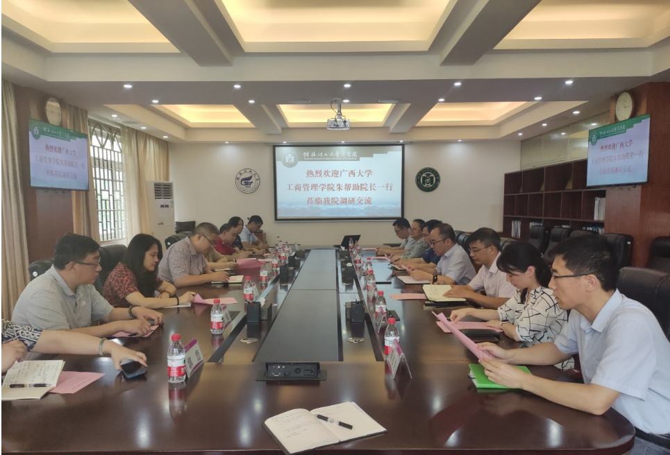 6月10日下午,广西大学工商管理学院一行来我院交流考察。学院党委副书记、副院长(主持工作)李雷,副院长王兴中,副院长蒙永亨,院长助理梁健爱、罗薇,工商管理教研室主任鞠海龙,市场营销教研室主任卜正学在屏风校...
