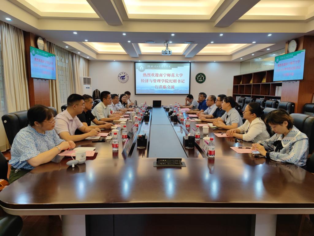 6月17日下午,南宁师范大学经济与管理学院一行来我院交流考察。学院党委书记白永生,副书记、副院长(主持工作)李雷,副书记沈菲菲,副院长王兴中,院长助理梁健爱,党政办主任李鑫,人力资源与管理教研室主任沈鸿,...