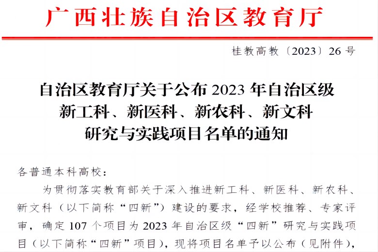 近日,自治区教育厅公布了2023年自治区级新工科、新医科、新农科、新文科研究与实践项目名单,我院沈鸿教授主持的《广西工科院校服务乡村振兴战略模式研究与实践》项目获新农科研究与实践项目。我院一直高度重视“四新”建设工作,立足国家战略和经济社会发展需求,统筹推进学院“四新”建设,不断调整优化学科专业结构,推动学科专业交叉融合,认真开展“四新”项目研究和教学改革实践,创新人才培养模式,为加快培养高质量创...
