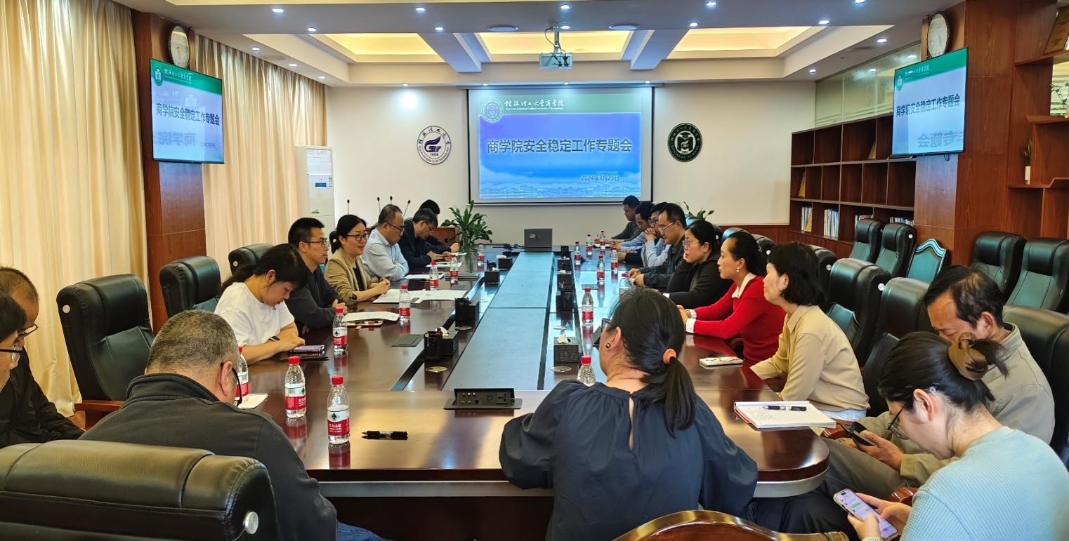 3月25日下午,学院安全稳定工作专题会在7206会议室召开。学院领导白凌婷,李雷,王兴中、卢智增、廖帅出席会议,各科室负责人参加会议。白凌婷首先传达了学校2024年安全稳定工作会议相关精神,并就进一步抓实抓牢学院安全稳定提出了三点要求:一是要高度重视,牢固树立安全稳定底线思维;二是要进一步加强教育,多措并举提升师生应对安全稳定的防范能力和处置能力;三是要狠抓安全稳定工作落实,精准研判分析,做好日常风险隐患...