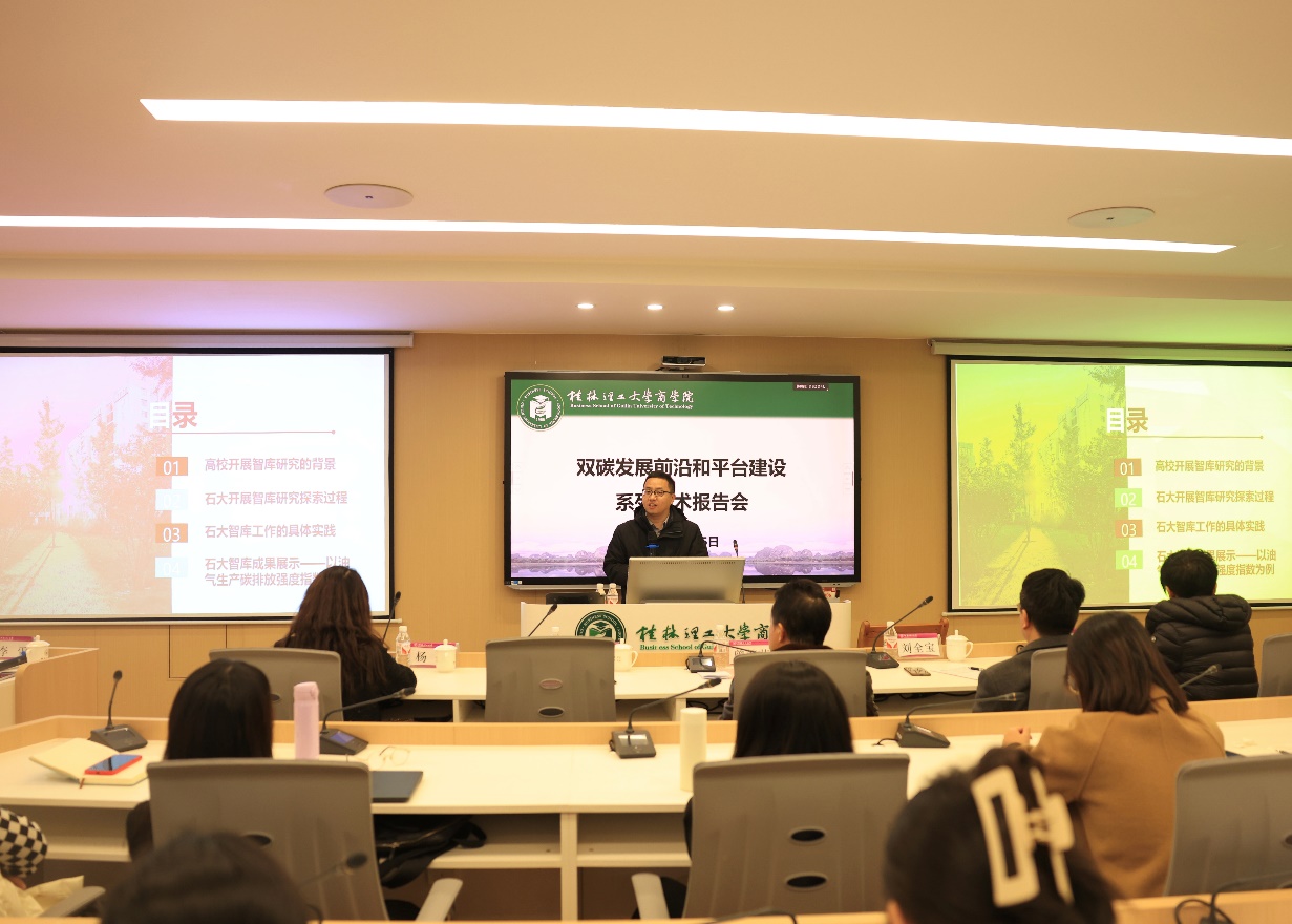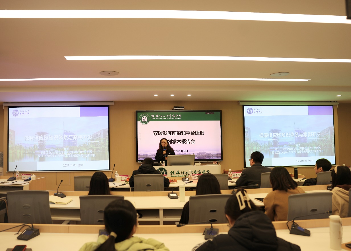 1月5日上午,我院在屏风校区7307报告厅举办了双碳发展前沿和平台建设系列学术报告会。本次会议邀请了中国石油大学(北京)经济管理学院院长、中国高等教育学会碳中和与清洁能源教育专业委员会副秘书长王建良教授,北京知链科技有限公司总裁刘全宝先生,西北工业大学管理学院长聘副教授、新时代企业高质量发展研究中心副主任杨倩老师分别做主旨报告。学校党委常委、总会计师曾繁荣出席会议。北京知链科技有限公司广西区负责人、...